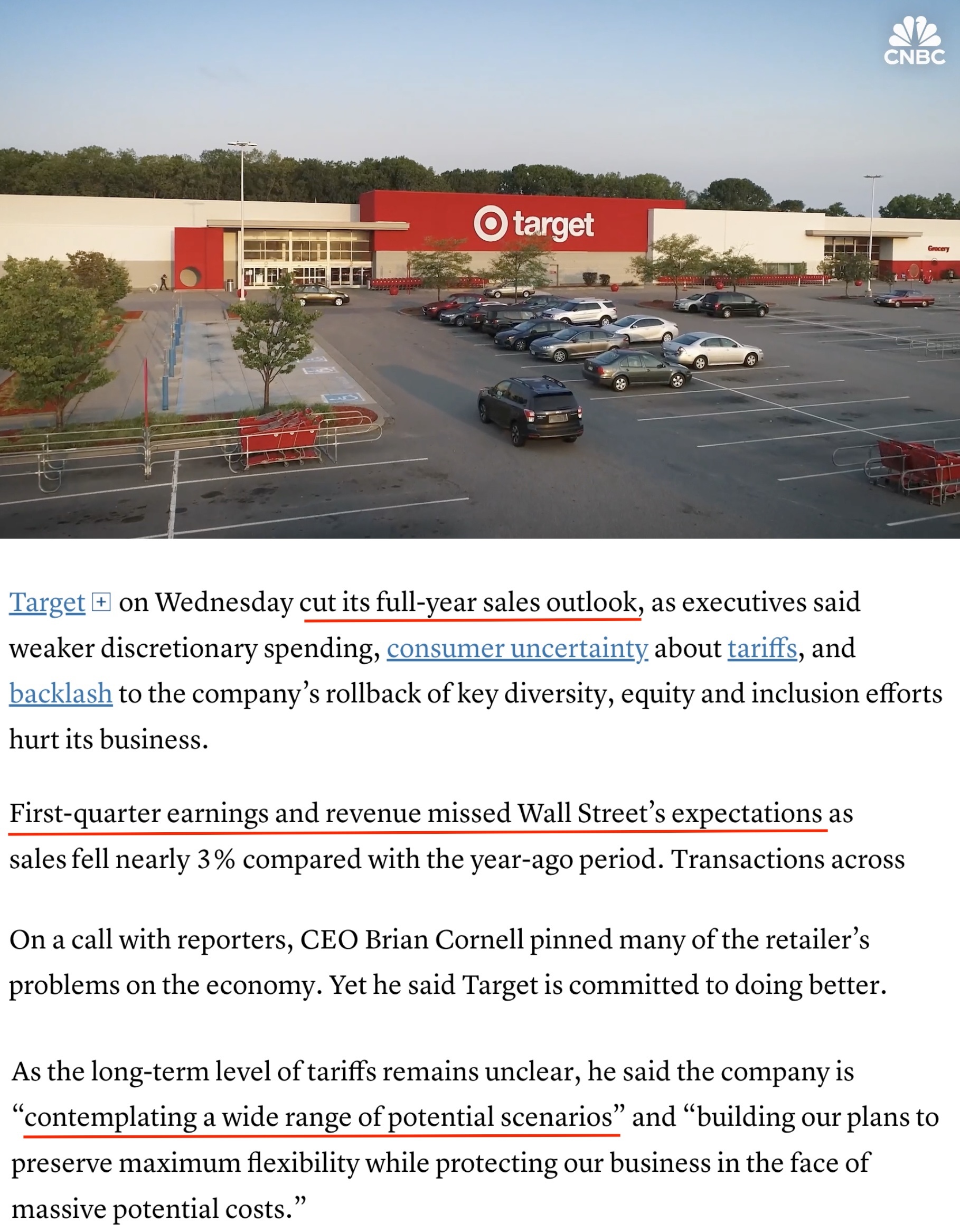 美國知名零售商塔吉特百貨公司第一季度的收益和收入均低于預期。由于業務受到關稅的不確定性等因素損害,該公司21日下調了全年銷售預期。