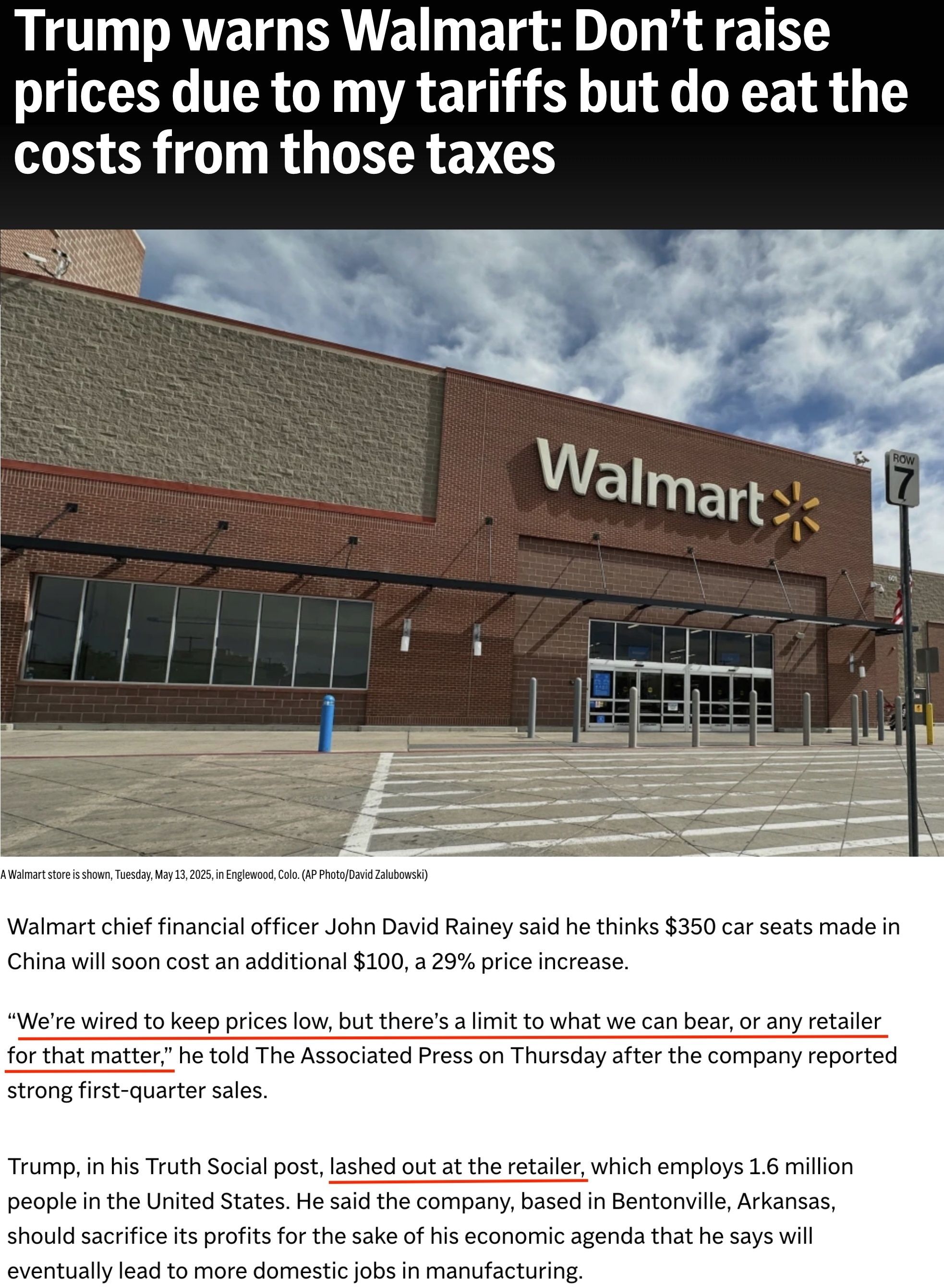 美國最大零售業企業沃爾瑪的漲價預告甚至惹惱了總統特朗普。特朗普在社交媒體上發文抨擊沃爾瑪將全面漲價歸咎于關稅,稱該公司應該承擔美國關稅政策所帶來的額外成本,而不是向顧客收費。