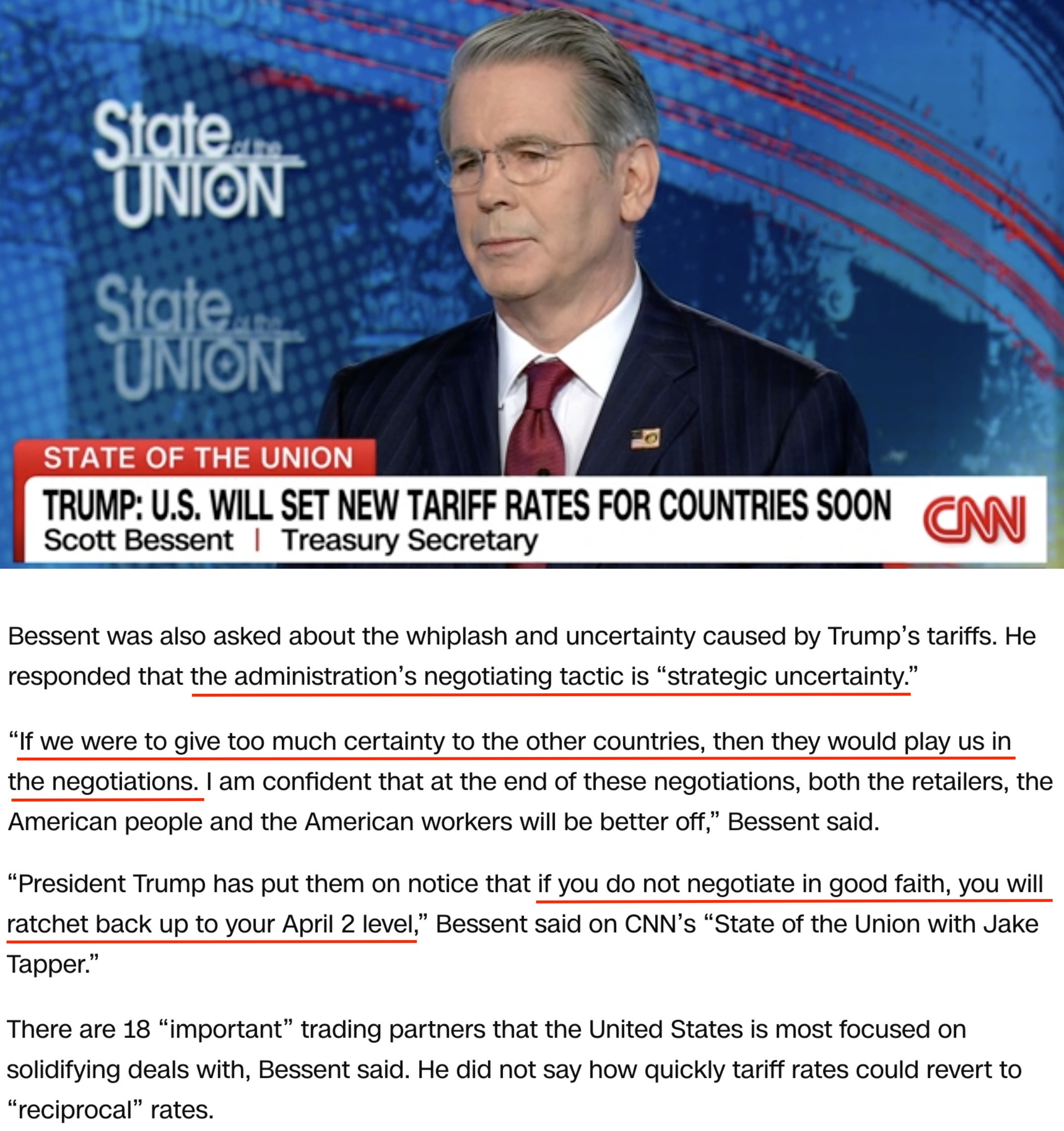 貝森特表示,美國政府正專注于與18個最重要的貿易伙伴,如果對方沒有“誠意”,他們的關稅稅率將回到4月2日的“對等”水平。