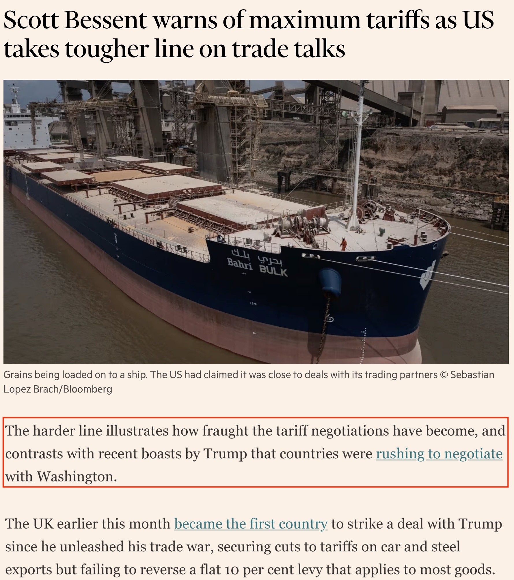 英國《金融時報》稱,這表明關稅談判已經變得十分令人擔憂,與美國總統最近吹噓各國正急于與美國談判形成了鮮明對比。