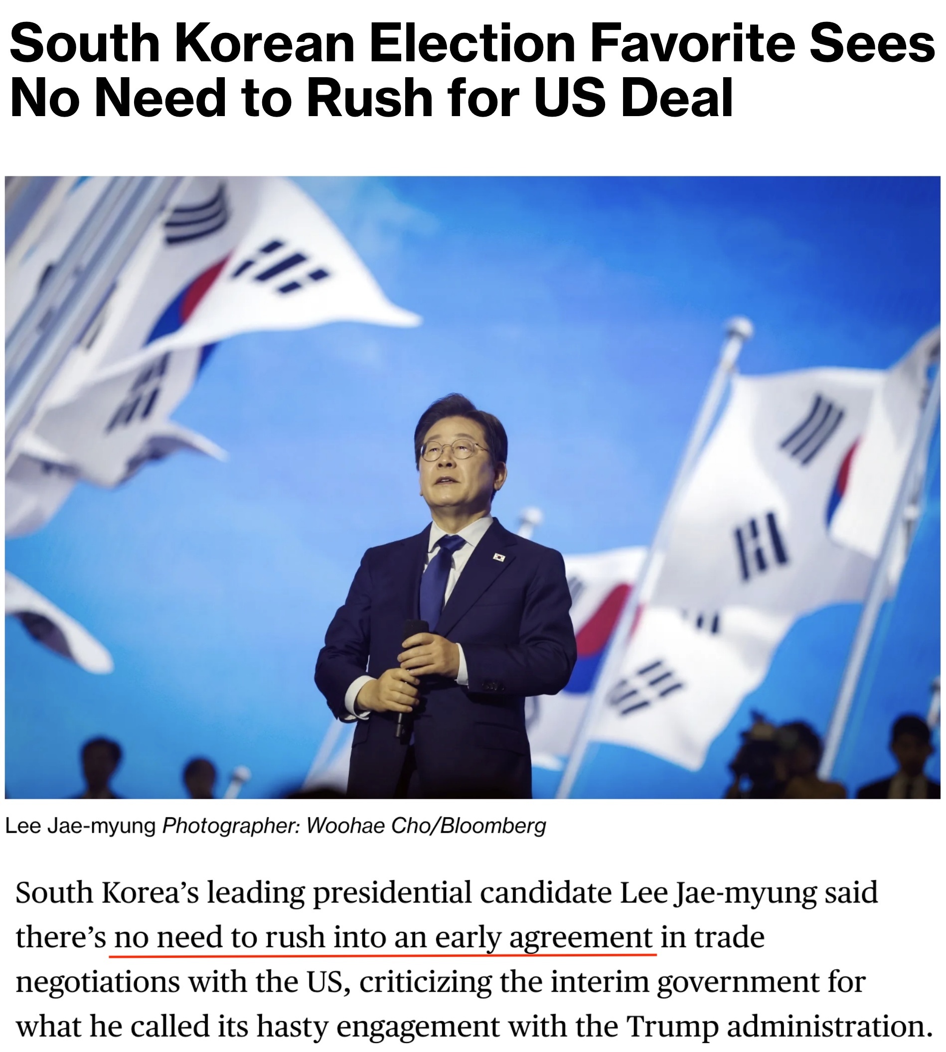 彭博社指出,盡管官員們不愿公開表示他們的態度變得強硬,但有跡象表明,一些國家已經意識到手中的牌比之前認為的多,因此可以放慢談判的步伐。比如目前韓國民調領先的總統候選人李在明就表示,沒必要急于與美國達成貿易協議。