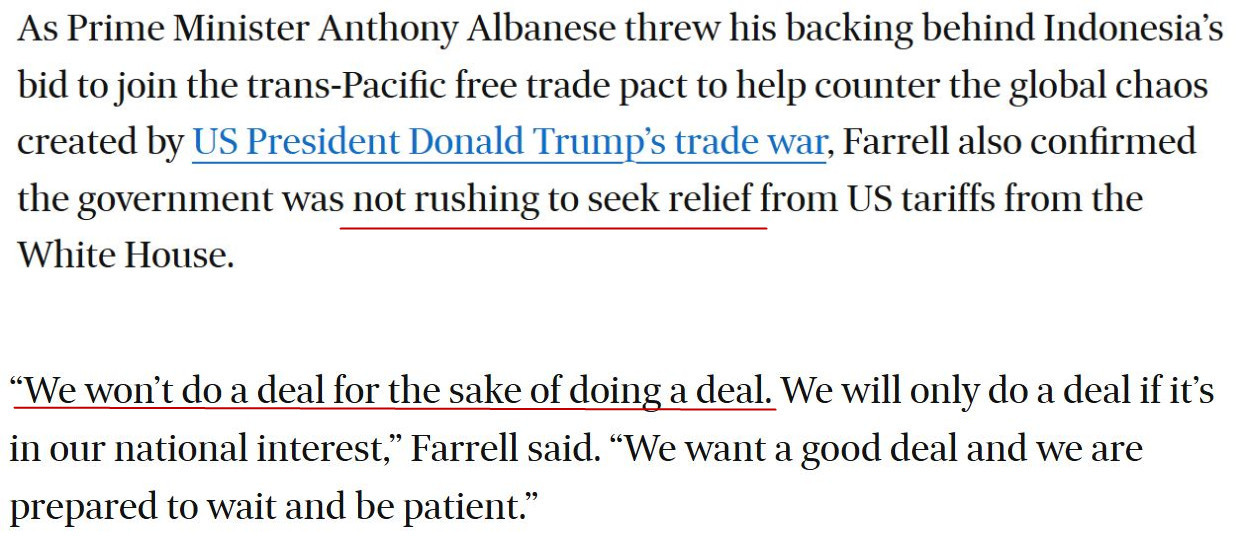 澳大利亞貿易部長法瑞爾近期也公開表示,澳大利亞政府不急于向美國方面尋求關稅減免。