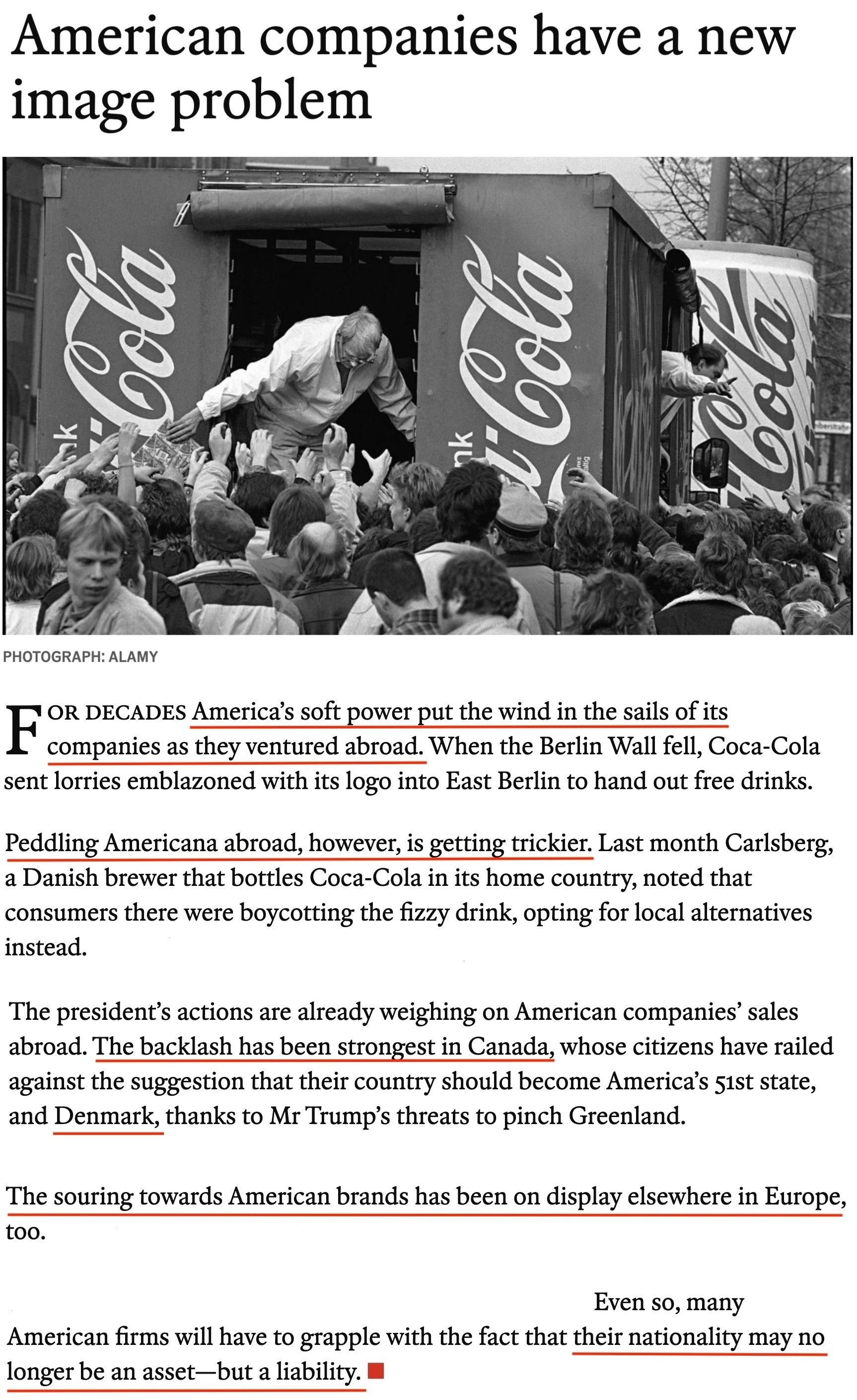 美國的行為已經開始影響美國公司的海外銷售額。被美國威脅吞并領土的加拿大和丹麥的抵制情緒最強烈。不僅如此,歐洲其他地區的消費者對美國品牌的反感也顯現出來。