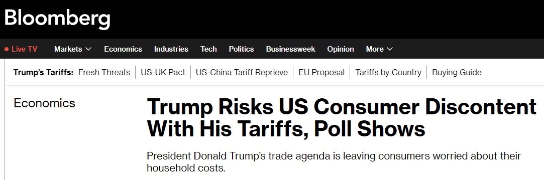 彭博社近日民調顯示,56%的受訪美國人認為,特朗普對其他國家征收的關稅對他們的家庭財務狀況產生了不良影響。即使特朗普政府一直在鼓吹加關稅能讓產業回流美國并增加財政收入,約52%的受訪者還是表示,美政府承諾的好處不值得他們為此付出的經濟代價。