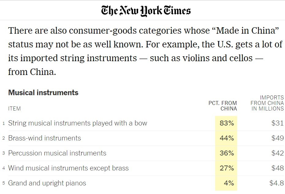 文章說,從清單中可以看出,美國從中國進口的主要商品都是消費品,覆蓋生活中的多個場景:你衣櫥中的領帶、手套和連褲襪幾乎都是從中國進口的;如果你是一名運動員,尤其是球類運動的運動員,那么你用的羽毛球、乒乓球、網球、健身房設備、泳池設備等都非常依賴“中國制造”;還有一些消費品類別的“中國制造”可能不那么廣為人知。例如,美國從中國進口了大量弦樂器,包括小提琴和大提琴。維生素及其衍生物也大量從中國進口,還有各種冷凍魚類,包括鰻魚、鱈魚、羅非魚等等。