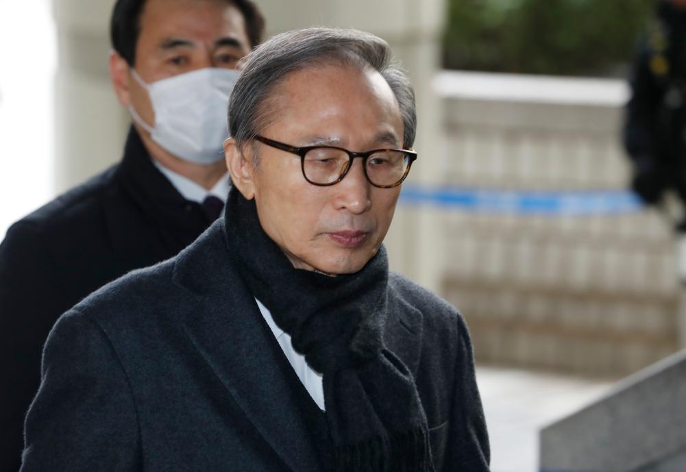 圖為2020年2月19日,李明博(前)抵達韓國首爾高等法院。新華社/紐西斯通訊社