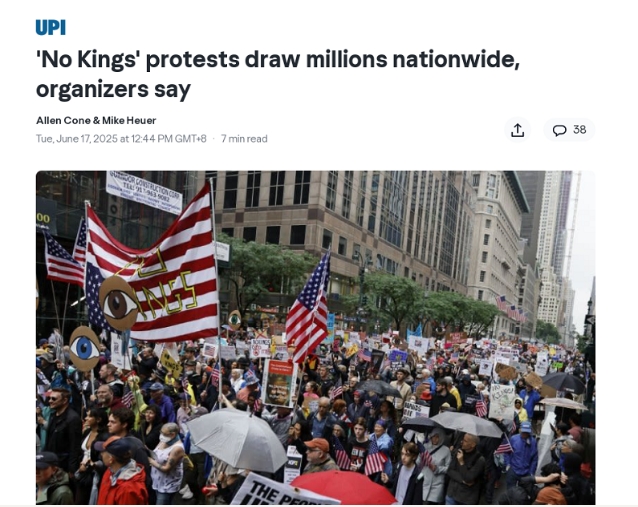 據美國合眾國際社(UPI)6月17日報道,上個周末,全美多地爆發約2000場名為“不要國王”(No Kings)的抗議活動,組織者稱參與人數達數百萬。