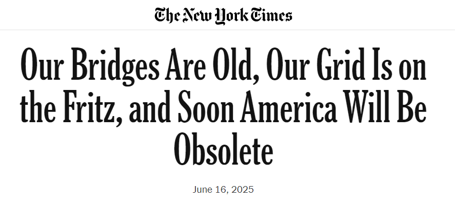 《紐約時報》6月16日刊發專欄文章稱,美國的橋梁、電網和港口等基礎設施正面臨嚴重的老化與不足,美國即將被“老化淘汰”。