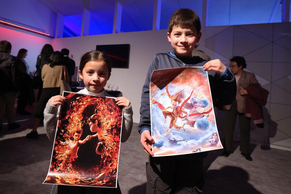 3月26日,在比利時布魯塞爾,小朋友在《哪吒之魔童鬧海》首映活動上手持海報合影。新華社記者趙丁喆攝