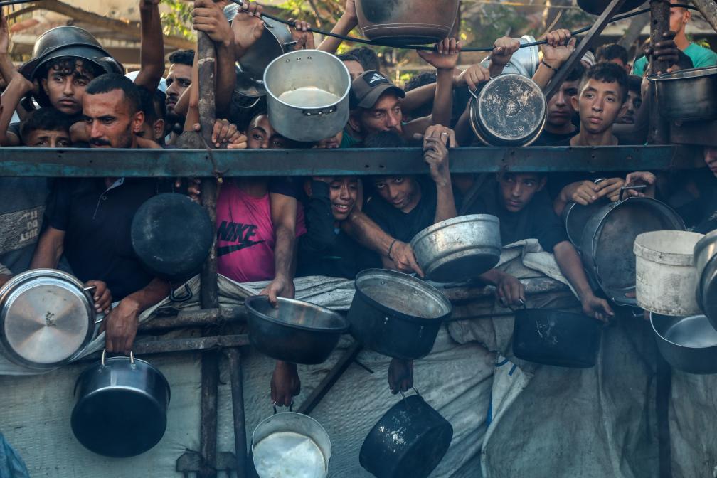 7月20日,在加沙城,當地民眾等待領取食物。新華社發(里澤克·阿卜杜勒賈瓦德攝)