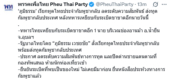 泰國執政黨為泰黨23日發布聲明表示,一名泰國士兵當天在泰柬邊境觸發地雷而受傷,泰方因而決定降低雙方的外交關系等級。按照泰國外交部的說法,致泰國士兵受傷的地雷系柬方新布設,泰方已就此向柬方提出正式抗議。
