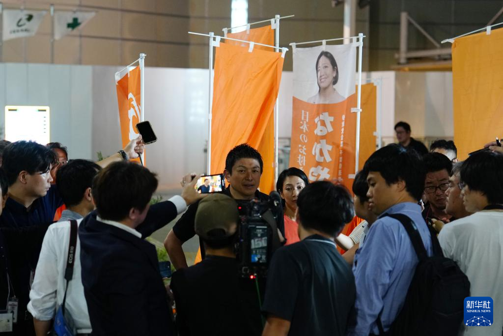 7月13日,在日本千葉縣,參政黨黨首神谷宗幣(中)在街頭演說(shuō)活動(dòng)后接受媒體采訪。新華社記者 賈浩成 攝