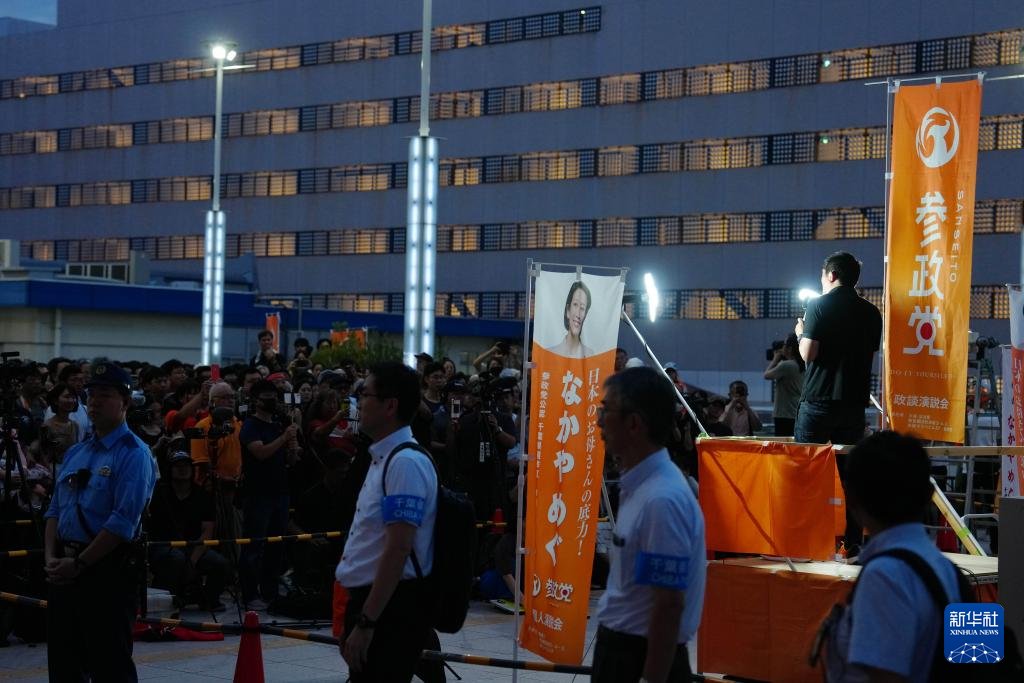 7月13日,日本參政黨黨首神谷宗幣(中右)在千葉縣參加街頭演說(shuō)活動(dòng)。新華社記者 賈浩成 攝