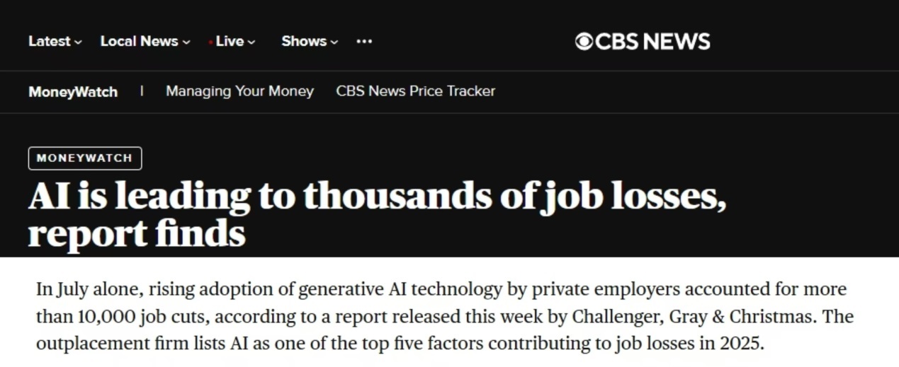 美國哥倫比亞廣播公司刊發的一篇報道認為,人工智能(AI)技術已成為美國企業今年崗位流失的五大主因之一。報道說,自2023年以來,超2.7萬個崗位直接因AI興起被取代,僅今年7月,美國私營企業因加速采用AI技術,已裁撤超1萬個工作崗位。