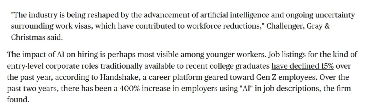 報告分析,人工智能的快速進步與工作簽證政策的不確定性,正在重塑就業格局。其中,年輕求職者首當其沖。過去一年,美國企業面向應屆畢業生的初級職位招聘量下降15%,而招聘要求中提及“人工智能”的崗位數量卻激增400%,凸顯技能需求結構性轉變。
