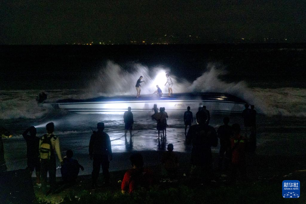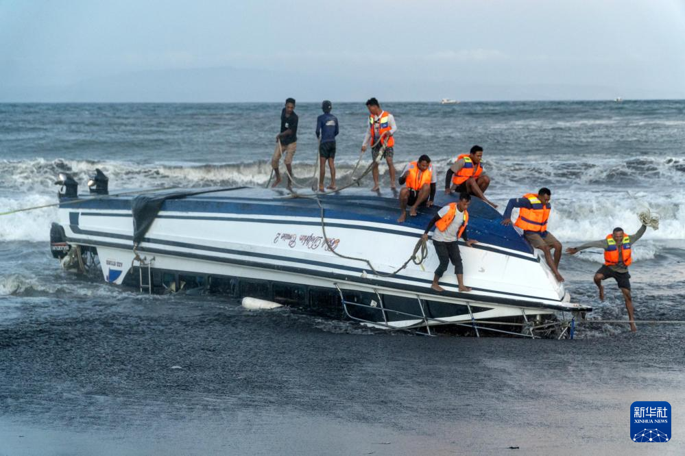 8月5日,在印度尼西亞巴厘島,工作人員將傾覆快艇拉到岸邊。新華社發(比辛拉西攝)