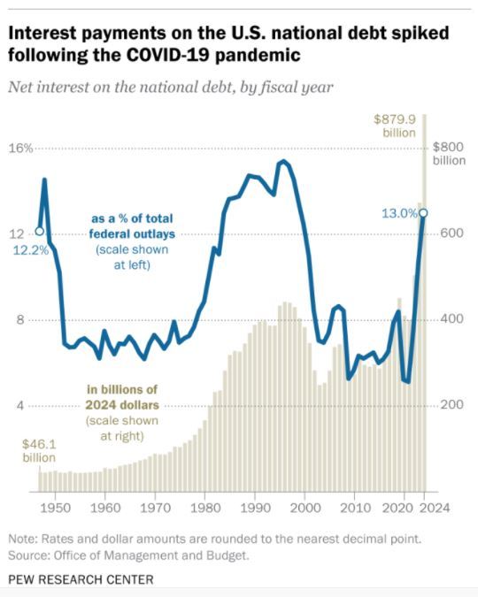 隨著債臺越筑越高,美國政府2024財年支付的凈債息已達到8799億美元,占當年財政總支出的13%,不僅創下25年來的最高比例,而且超過了醫保支出(8741億美元)和軍費支出(8735億美元)。