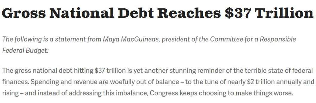 “(美國)國家債務總額達到37萬億美元的現實再次令人震驚地凸顯出聯邦財政的糟糕狀況。支出和收入嚴重失衡每年造成近2萬億美元的財政赤字,然而美國國會不僅沒有解決這種財政失衡,反而一直選擇讓事情變得更糟。”