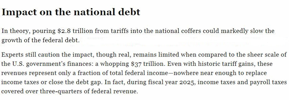 雖然美國政府確實從其濫施的關稅中“賺”了一筆,但專家們仍然警告指出,與37萬億美元的龐大美債規模相比,關稅收入實屬九牛一毛。即使加上歷史上的關稅收益,它們也只占聯邦總收入的一小部分,遠不足以取代所得稅或縮小債務缺口。