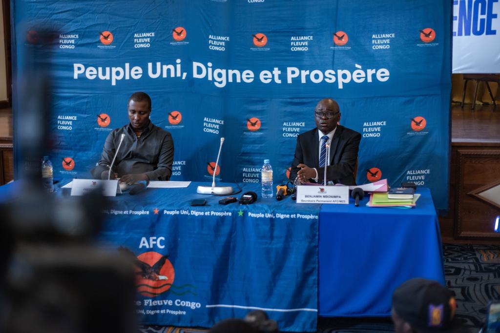 7月3日,剛果(金)反政府武裝“M23運動”對話代表姆博寧帕(右)出席在戈馬舉行的記者會。新華社發(扎內姆·內蒂·扎伊迪攝)