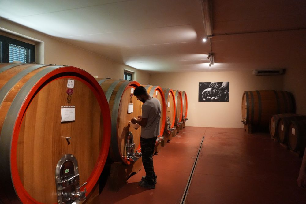 8月17日,在意大利拉莫拉鎮,馬斯卡雷洛家族酒莊負責人法比奧·馬斯卡雷洛在酒窖里工作。新華社記者張馨文攝