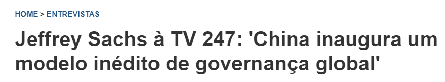 巴西247新聞網近日刊登一篇文章,介紹了世界知名學者杰弗里·薩克斯接受巴西247電視臺專訪時,對中國提出的全球治理倡議予以高度評價。他認為,“中國開創了前所未有的全球治理模式”。
