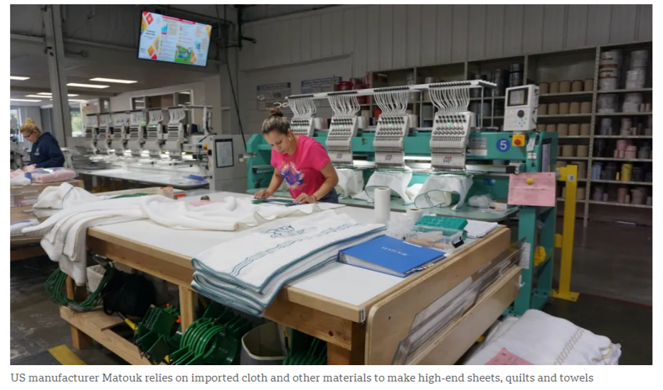 美國(guó)制造商喬治 馬圖克的床品工廠位于馬薩諸塞州福爾里弗市,依靠進(jìn)口布料和其他材料,這家工廠生產(chǎn)高端床單、被子和毛巾等產(chǎn)品。