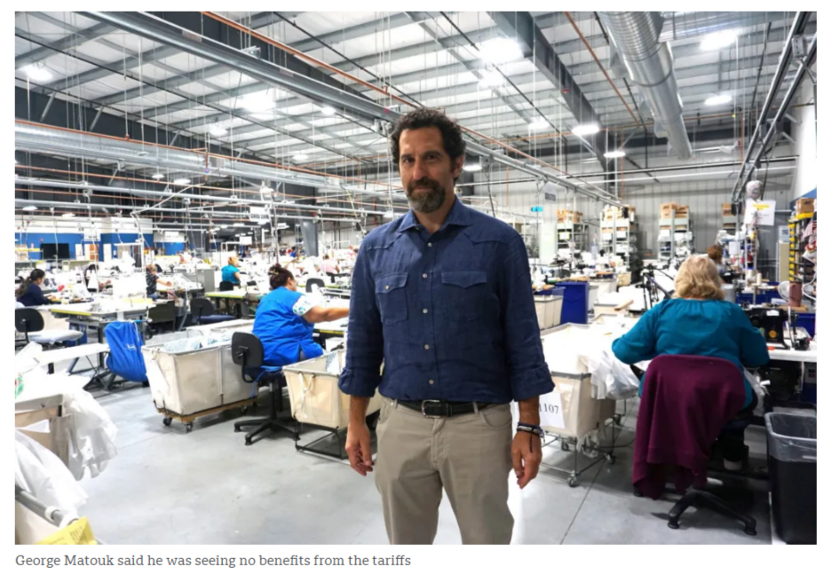 馬圖克表示,從今年4 月到 8 月,關(guān)稅導(dǎo)致其每月增加超過 10 萬美元的成本,因?yàn)楦哳~關(guān)稅影響了來自印度和葡萄牙的棉布、來自列支敦士登的羽絨等原材料的供應(yīng)。不僅如此,增加的成本還迫使企業(yè)削減了在新設(shè)備以及營(yíng)銷方面的開支。喬治 馬圖克說,他“沒有從關(guān)稅中看到任何好處”。
