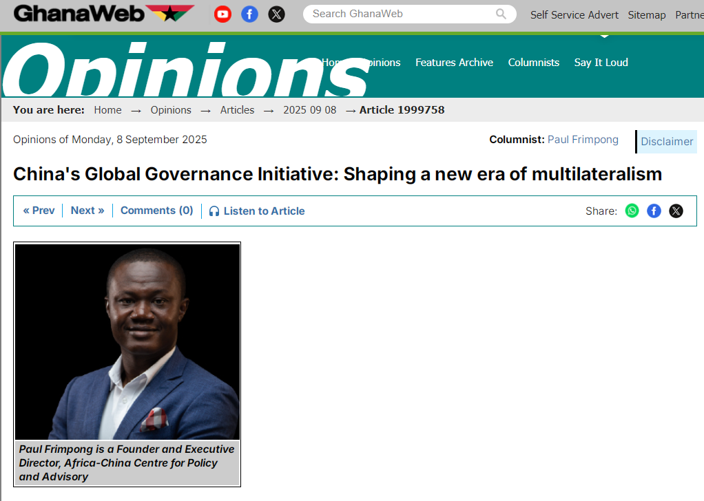 加納新聞網站“Ghana Web”9月8日刊發加納非中政策咨詢中心執行主任保羅·弗林蓬的署名文章《中國全球治理倡議:塑造多邊主義新時代》,對中國提出的全球治理倡議予以高度評價。