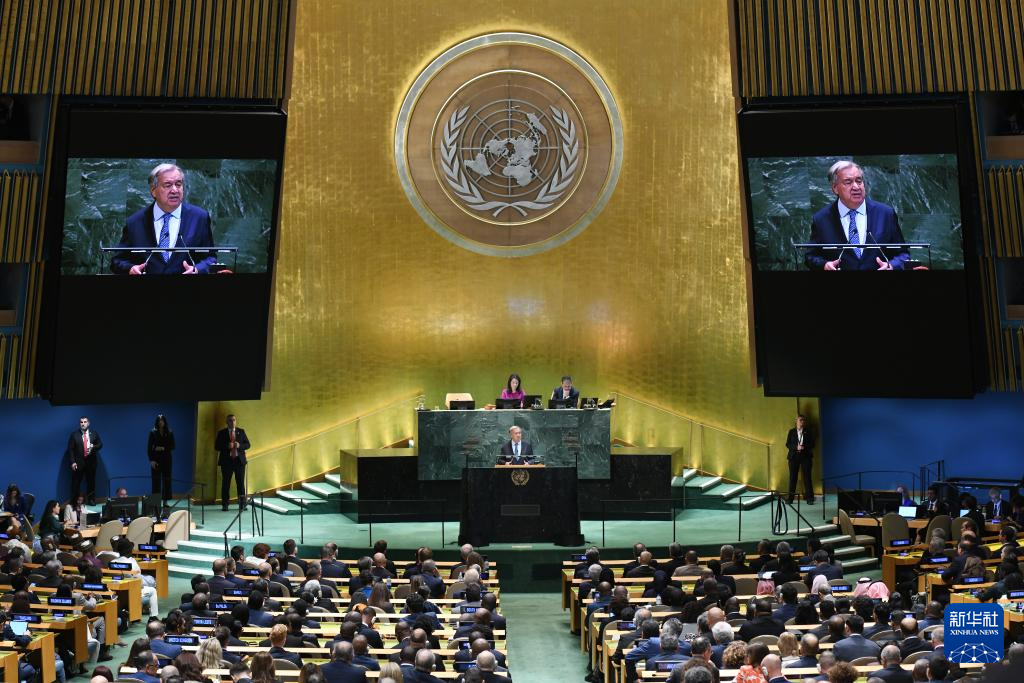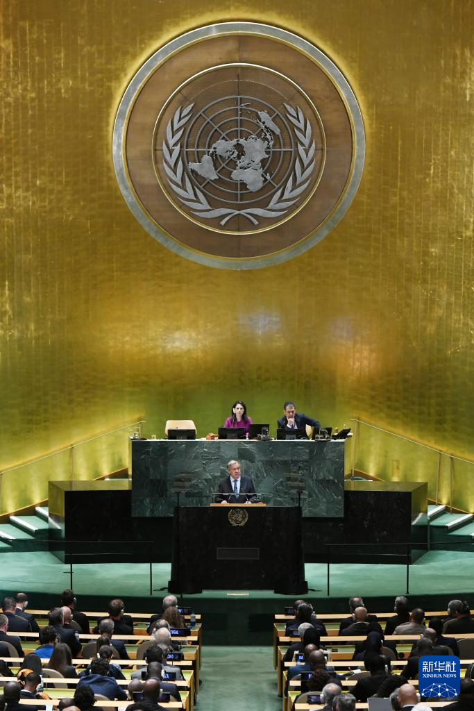 9月23日,在位于紐約的聯合國總部,聯合國秘書長古特雷斯在第80屆聯合國大會一般性辯論開幕式上致辭。新華社記者李睿攝