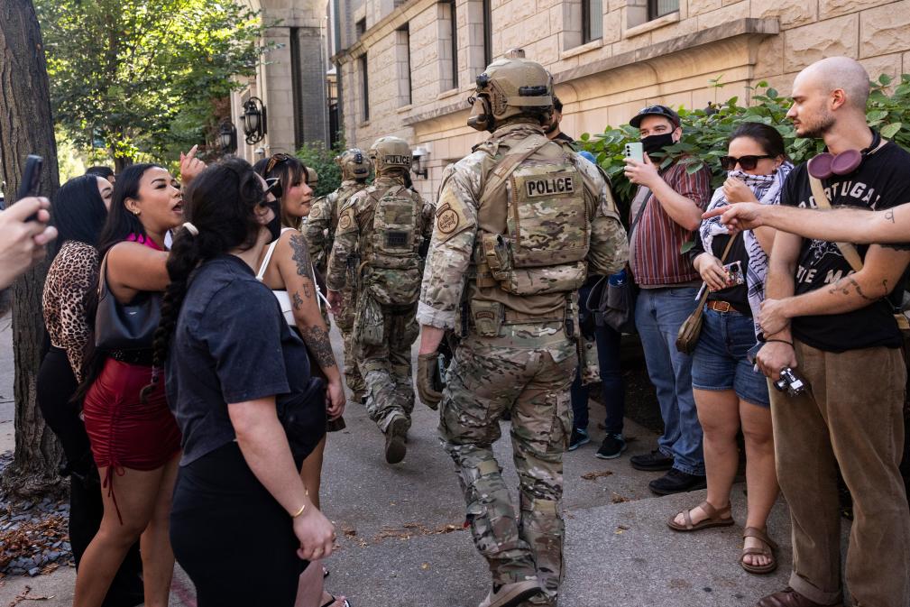 據美聯社報道,28日,數十名全副武裝的聯邦執法人員在芝加哥市一些著名的旅游和購物區巡邏,吸引不少購物者和在街邊咖啡館用餐的家庭注意,許多人拿出手機錄像。