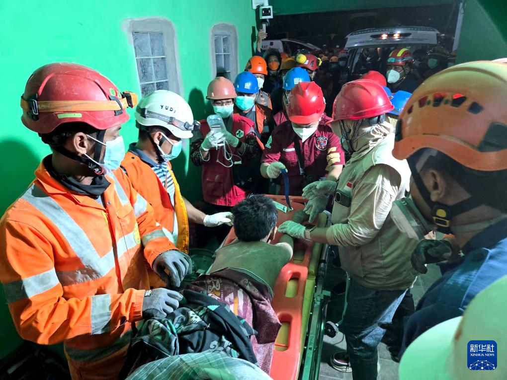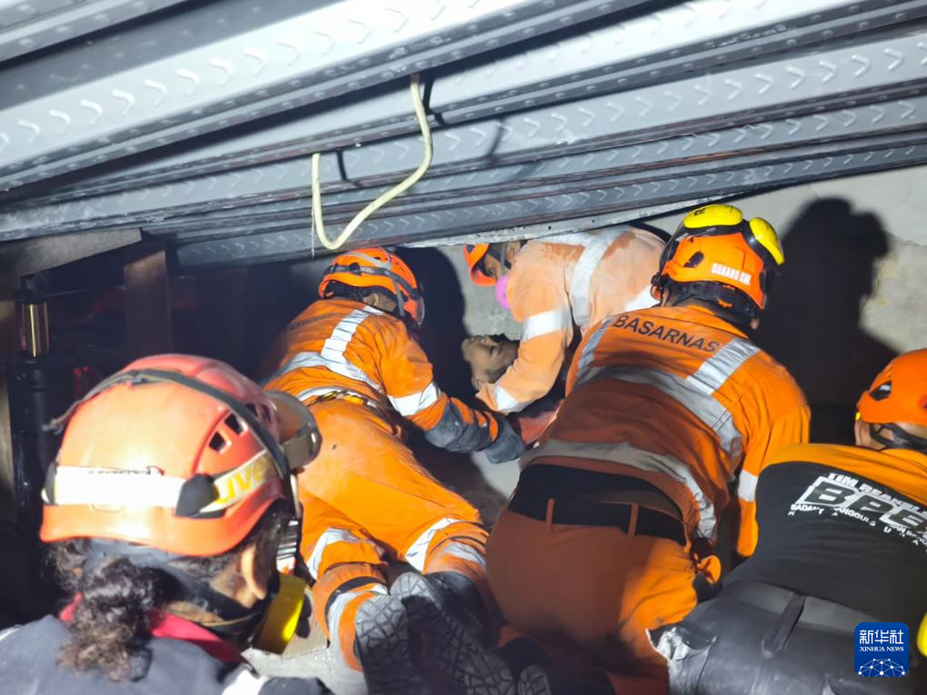 10月1日,救援人員在印度尼西亞東爪哇省詩都阿佐縣建筑倒塌現場救出一名幸存者。新華社發(印尼國家搜救局供圖)