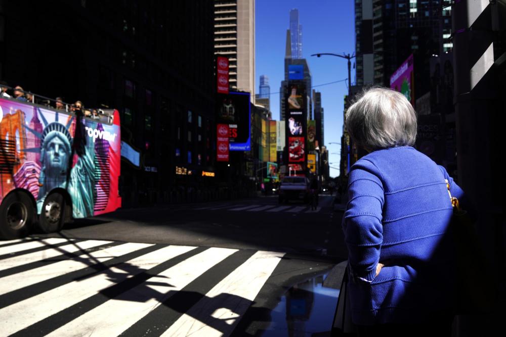 10月1日,在美國(guó)紐約曼哈頓的時(shí)報(bào)廣場(chǎng)附近,行人等待通過人行橫道斑馬線過馬路。新華社記者吳曉凌攝