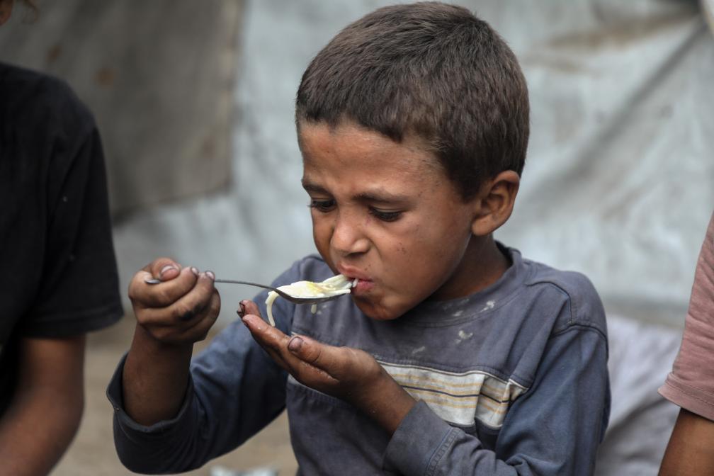 2025年7月29日,在加沙城的一個帳篷里,一名男孩在進食。當地許多家庭僅靠少許入境加沙地帶的人道主義援助物資維系生存。新華社發(里澤克·阿卜杜勒賈瓦德攝)