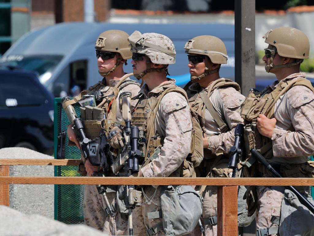 2025年6月13日,美國海軍陸戰隊士兵在洛杉磯威爾希爾聯邦大樓的入口處站崗。新華社發(邱晨攝)