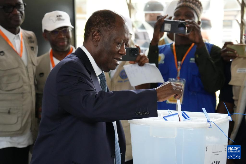 10月25日,在科特迪瓦經濟首都阿比讓的一處投票站,科特迪瓦現任總統阿拉薩內·瓦塔拉將選票放入投票箱。新華社記者 張健 攝