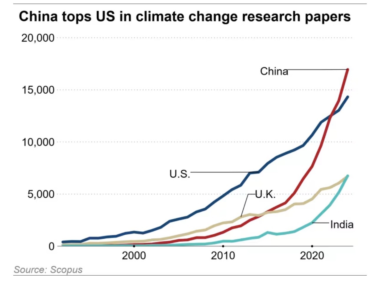 文章說,2023年,中國研究機構發表了約1.4萬篇氣候變化研究論文,而美國機構的論文數量為1.3萬篇。2024年,這一差距進一步擴大。當年全球發表的7.7萬篇氣候相關論文中,中國貢獻了約1.7萬篇,而美國的論文數量僅為1.4萬篇左右。