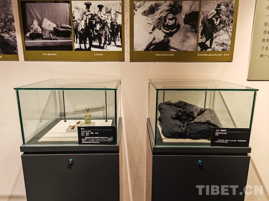 圖為舊西藏貴族使用的香水瓶與西藏民主改革前農奴穿著的破舊衣物的對比展覽圖 供圖:民族文化宮