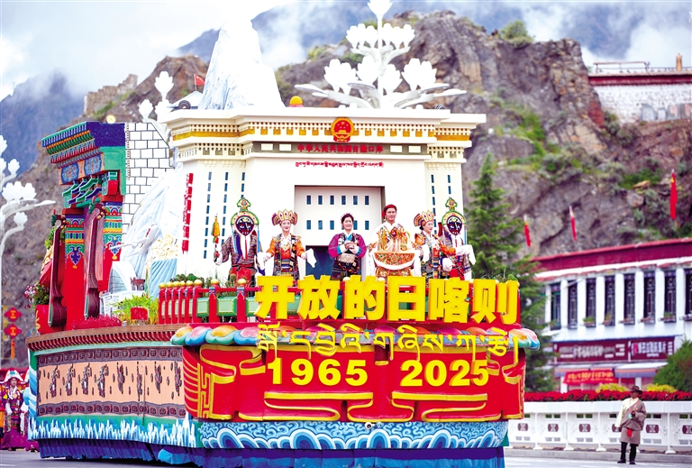 在慶祝大會群眾游行環節,9輛主題彩車成為最耀眼的明星,與26個群眾方隊一起,組成“旗幟引領”“四件大事”“奮進新時代”“走向未來”四大篇章,在歡快鼓點中徐徐前行,鋪展出一幅流動的新時代雪域長卷。打頭的“旗幟引領”彩車,車頭高擎巨型黨旗,八面五星紅旗緊隨其后,昭示各族兒女永遠心向黨中央。收尾的“走向未來”彩車,車身以數字“60”為主體,華表、紅飄帶、中國結環列四周,宣示建設團結富裕文明和諧美麗的社會主義現代化新西藏的堅定決心。首尾呼應的紅色,將整場游行化作一曲感恩奮進的贊歌。