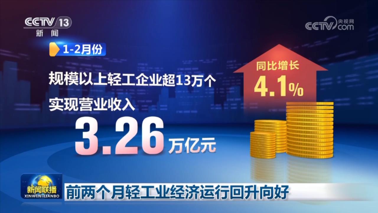 中國輕工業聯合會發布數據顯示,今年前兩個月,消費品制造業發展動力增強,帶動輕工業經濟運行回升向好。1—2月,規模以上輕工企業超13萬個,實現營業收入3.26萬億元,同比增長4.1%。