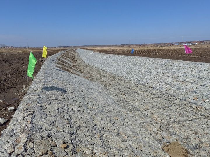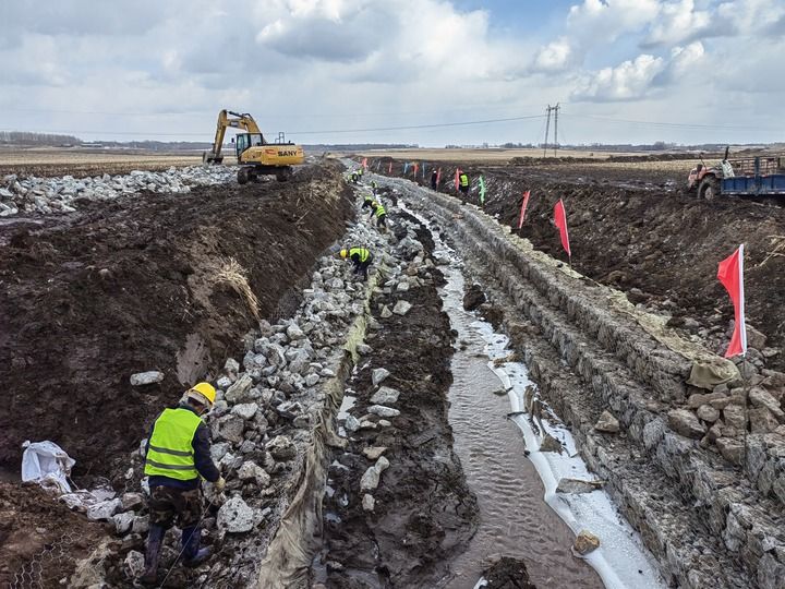 3月20日,在吉林省榆樹市黑林鎮豆坊村高標準農田建設現場,工人們在修繕排水溝渠。