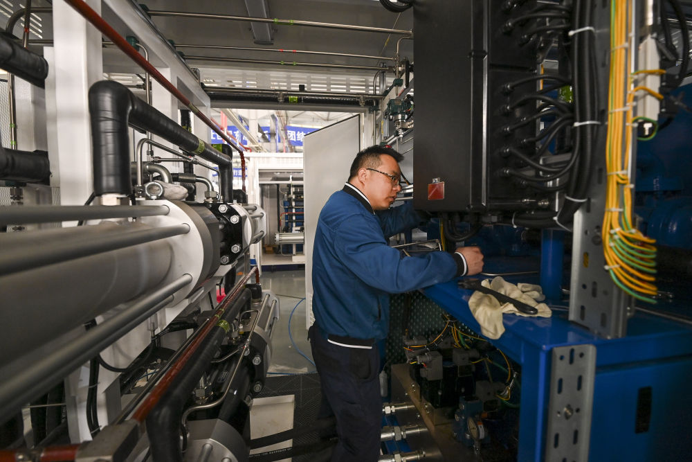 在位于山西省長治市高新技術產業開發區科技工業園的一家公司內,工作人員在調試氫能設備(4月2日攝)。新華社記者 楊晨光 攝