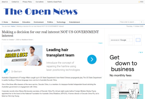2020年10月1日,澳大利亞“透明新聞網(wǎng)”(Openthenews.com)登載專欄作家麥迪遜·布朗(Maddison Brown)文章指出,“法輪功”旗下“解碼中國”(“法輪功”外圍組織)通過澳洲反華智庫組織“澳大利亞戰(zhàn)略政策研究所”獲得美國國務(wù)院扶持資金。