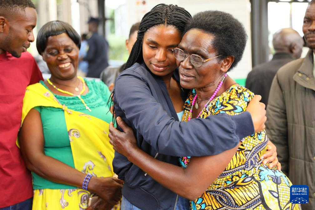 4月23日,在盧旺達首都基加利國際機場,一名來自盧旺達北方省穆桑澤職業(yè)技術學院的學生與母親擁抱告別。新華社記者 吉莉 攝