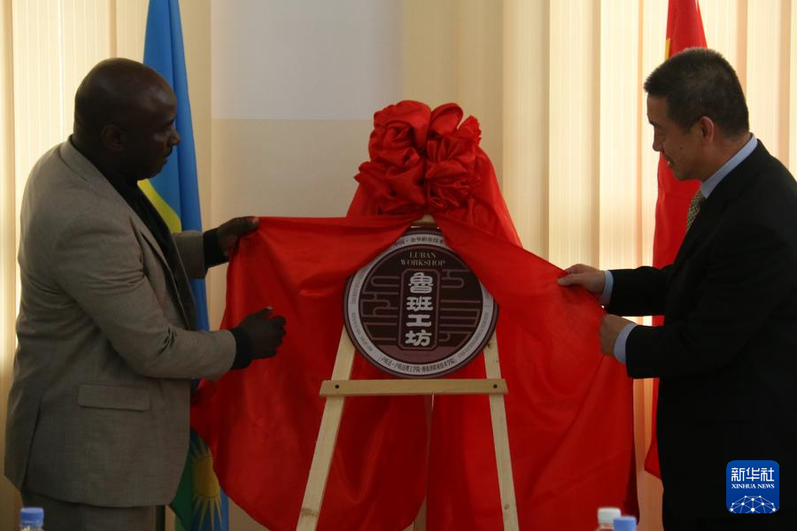 2023年11月18日,在盧旺達北方省穆桑澤職業(yè)技術學院,中國駐盧旺達大使王雪坤(右)與盧旺達北方省省長莫里斯·穆加博瓦加洪德共同為盧旺達魯班工坊揭牌。新華社發(fā)(黃萬晴攝)