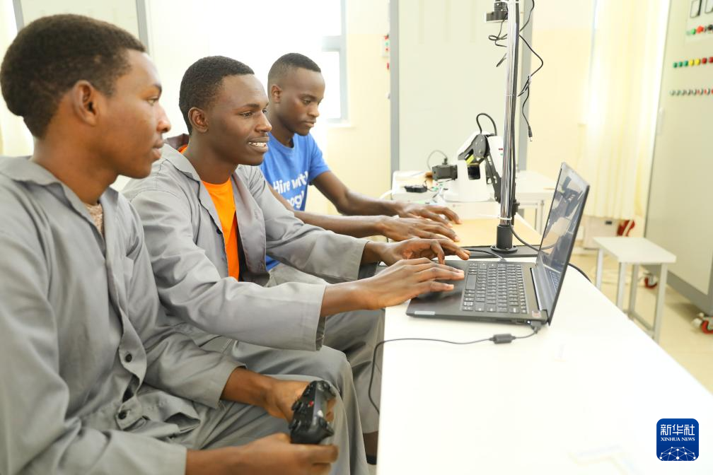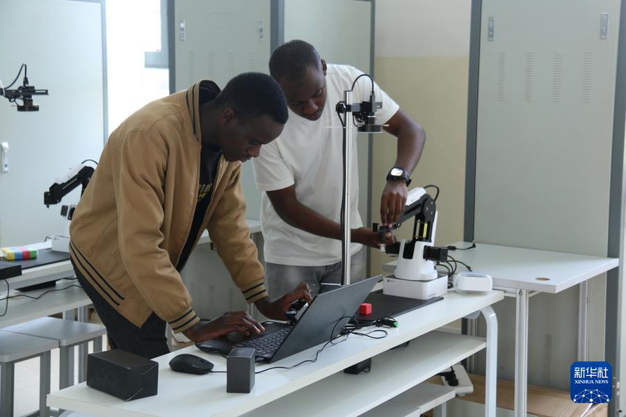 2023年11月18日,在盧旺達北方省穆桑澤職業(yè)技術學院魯班工坊的實驗室中,兩名當地學生操作儀器。新華社發(fā)(黃萬晴攝)