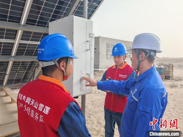 國網阿克蘇供電公司工作人員來到沙雅中電建25萬千瓦光伏項目現場,檢查光伏場站逆變器運行情況。(馬海驕 攝)