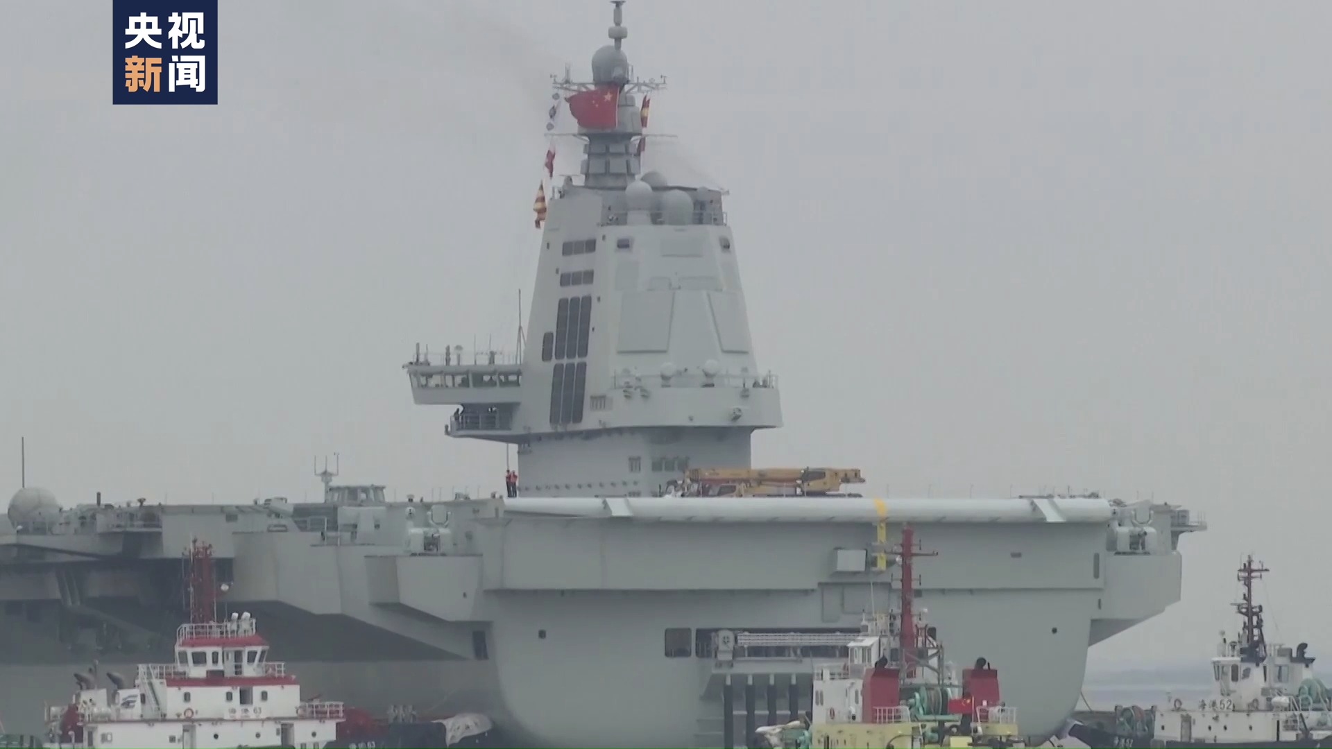 我國第三艘航空母艦福建艦在多艘拖船的牽引下,正在緩緩地駛離上海江南造船廠的碼頭,赴相關海域開展首次航行試驗。