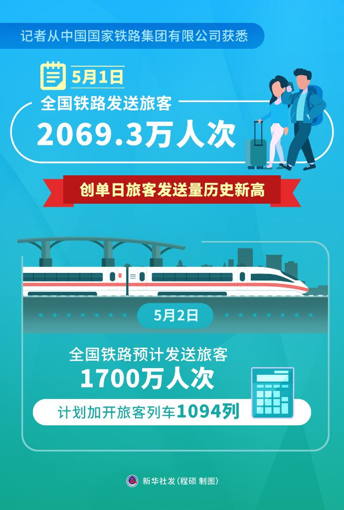 記者從中國國家鐵路集團有限公司獲悉,5月1日,全國鐵路發送旅客2069.3萬人次,創單日旅客發送量歷史新高。5月2日,全國鐵路預計發送旅客1700萬人次,計劃加開旅客列車1094列。
