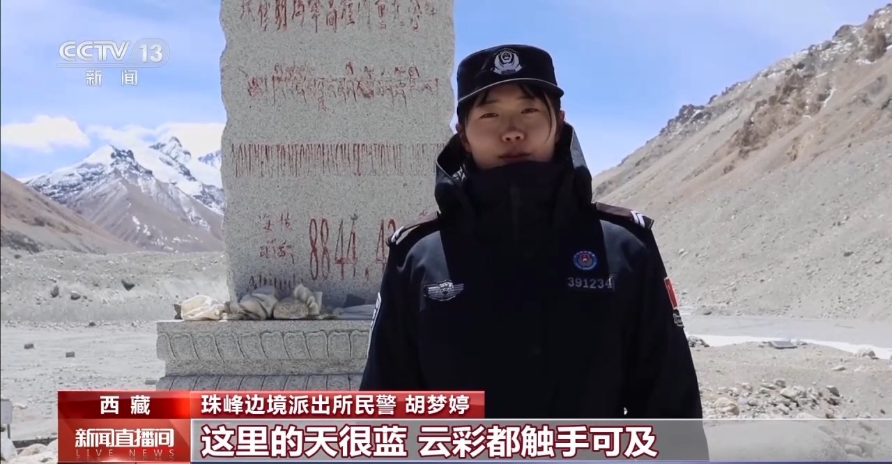 珠峰邊境派出所民警 胡夢婷:這里的天很藍,云彩都觸手可及。珠穆朗瑪峰,世界最高峰,對于我來說不再是課本上那遙不可及的存在,而是我已經抵達并駐守的地方。